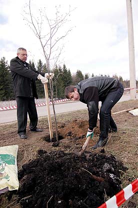 Корреспондент БНКоми ошибочно посчитал, что на этом миссия статусных озеленителей исполнена и ошибся. Роман Зенищев со своим замом без устали засыпали в лунки еще пять саженцев.