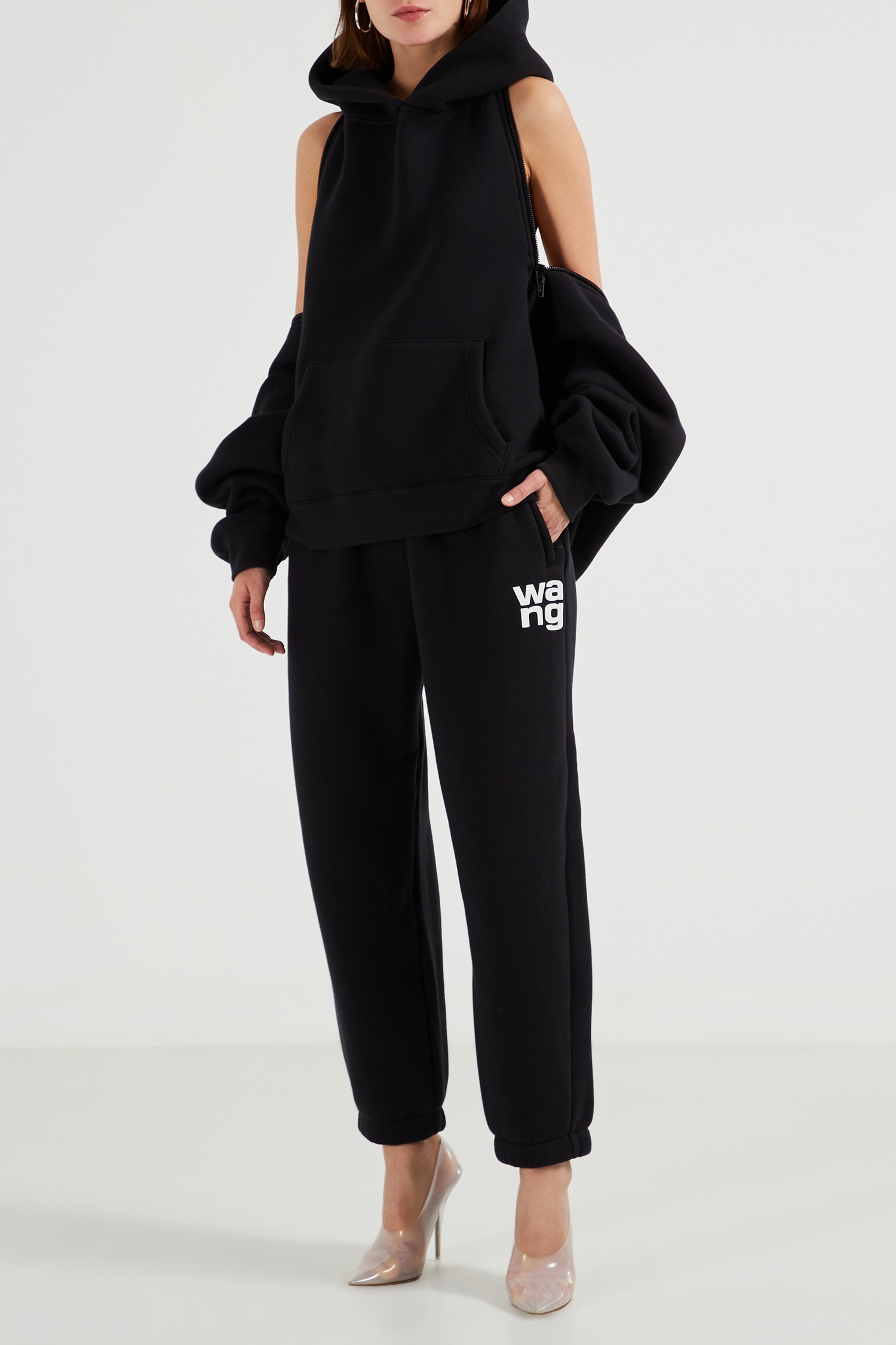 Черные брюки alexanderwang.t из плотного трикотажа с боковыми карманами уравновешивают воздушные прозрачные шпильки. Они не конфликтуют по цвету, визуально создают легкий, парящий над землей силуэт. В таком виде можно запросто отправляться на fashion party или в кафе с подругами.