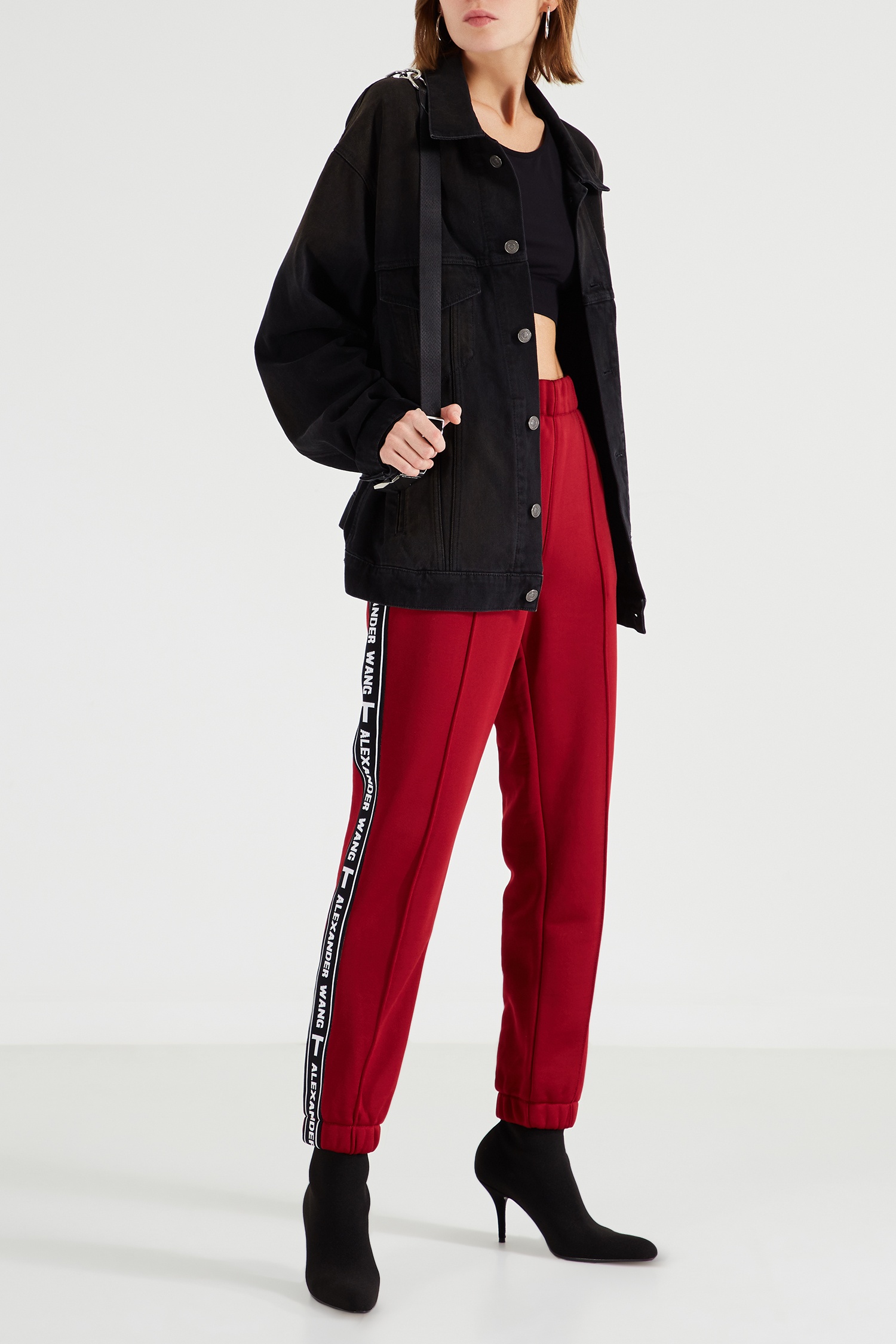 Насыщенно-красные женские штаны с лампасами alexanderwang.t и мягкие замшевые ботильоны – сочетание, без сомнения, беспроигрышное. Такие брюки идеально заменят любимые джинсы. Они стильные, комфортные и не сковывают движений. Модель из хлопкового трикотажа с застроченными стрелками идеально подходит для межсезонья.