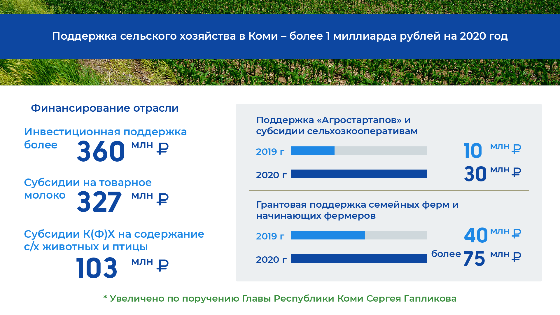 Как сообщает пресс-служба главы Коми, в 2020 году объем господдержки сельскохозяйственной отрасли превысит миллиард рублей, что на 17% больше уровня 2019 года. В рамках исполнения поручения главы Коми Сергея Гапликова региональный Минсельхоз привлёк на развитие отрасли дополнительные федеральные средства. По ряду направлений планируется увеличить республиканское финансирование.