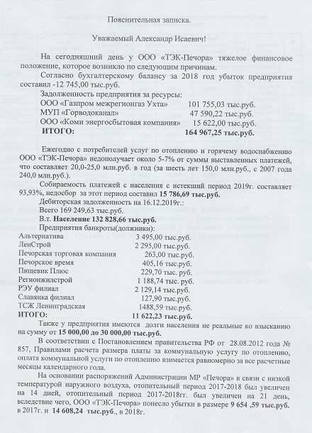 Как следует из пояснительной записки к поступившему в совет Печоры письму, причиной просьбы о надбавке стало тяжелое финансовое положение предприятия, задолженность которого перед ресурсоснабжающими организациями за газ, воду и свет достигла 165 млн рублей. Только за 2018 год убыток предприятия составил 12,7 млн рублей, говорится в обращении.