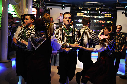 После трех ярких национальных номеров пришло время «дискотечного» блока. Вся вечеринка была построена по этому принципу: сольные номера, среди которых были и национальные игры, чередовались с танцами под современные обработки национальных песен. Уже после первого дискотечного блока публика заметно оживилась. Виной тому были больше знакомства и совместные игры, чем алкоголь: на столах гостей не было замечено ничего крепче пива, хотя большинство молодых потягивало сок.