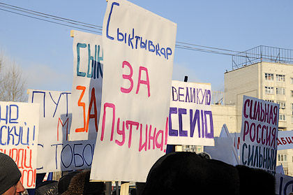 Сегодня в полдень в Сыктывкаре на площадь «под часами» возле республиканского стадиона состоялся митинг в поддержку кандидата в президенты РФ Владимира Путина. Акция собрала более полутора тысячи сторонников кандидата в президенты. Для участия в митинге прибыли граждане из многих муниципалитетов - Воркуты, Усинска, Ухты, Сосногорска, Сыктывкара, Удорского, Сыктывдинского, Сысольского и других районов Коми. Для акции была смонтирована сцена, установлена мощная звукоусиливающая аппаратура.