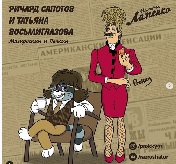 Прокопий Уляшов назвал новый мэшап «Мульты Лапенко». Так роль Инженера примерил Кот Леопольд, Ричарда Сапогова и Татьяны Восьмиглазовой – Кот Матроскин и Почтальон Печкин.