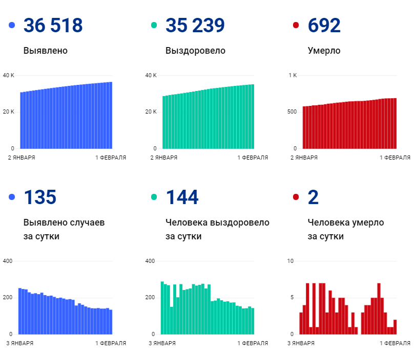 По информации сайта стопкоронавирус.рф, на 11:00 1 февраля 2021 года в Коми официально подтверждены 36 518 случаев заболевания новой коронавирусной инфекцией (+135 за сутки).