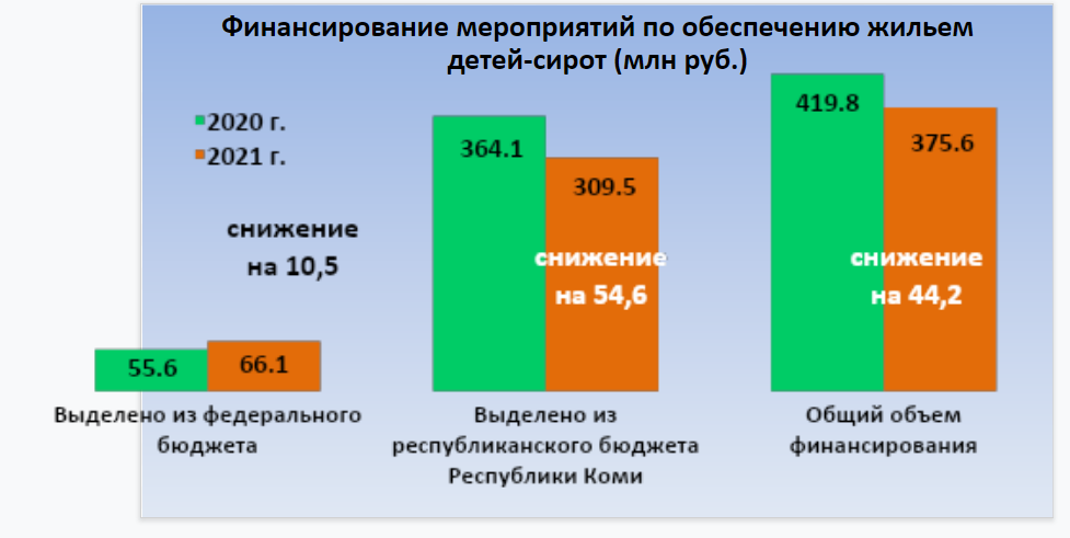 В Коми в декабре 2020 года была принята региональная программа, предусматривающая обеспечение жильем более 2 тыс. сирот в течение пяти лет. Заложенный в программу объем финансирования — 1,8 млрд рублей.