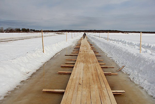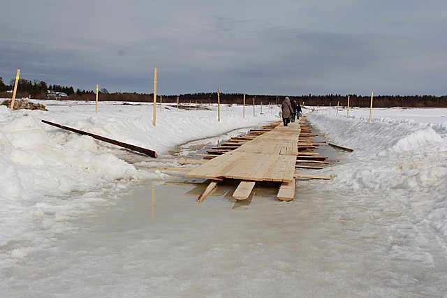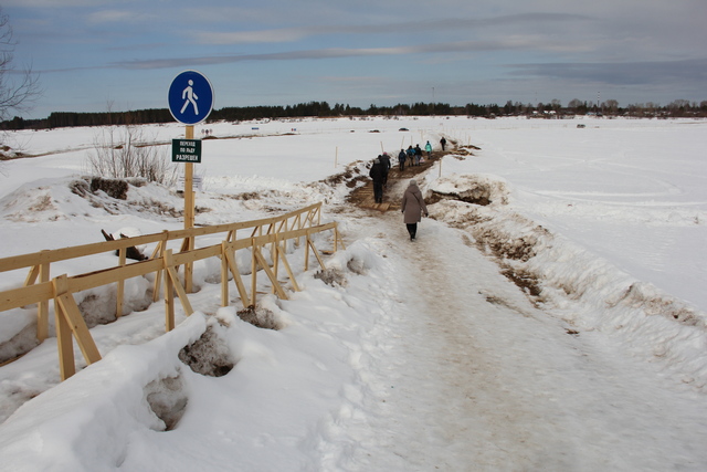 Пешеходная тропа через реку Вычегду в местечке Алешино в настоящее время затоплена водой. Установку мостков на ледовой переправе планируют завершить к 31 марта, сообщает пресс-служба администрации столицы Коми.