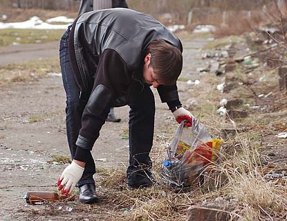 Роман Зенищев приехал в начале десятого. К тому времени в качестве трудового инструмента ему достался лишь пустой мусорный пакет. Г-н Зенищев решил собирать мусор на месте, где когда-то стояли зрительные трибуны. От подчиненных мэра отгораживал забор.