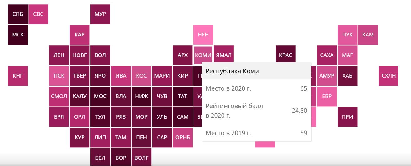 Два субъекта федерации опустились более чем на пять мест. Это Республики Коми и Марий Эл, каждый из этих регионов потерял по шесть позиций по сравнению с прошлым годом. По итогам 2020-го Коми заняла 65-е место среди других регионов, обогнав два субъекта СЗФО - Псковскую область и НАО.