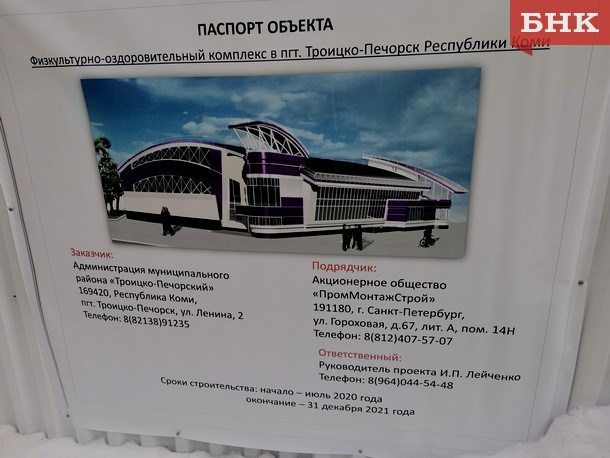 Как сообщили БНК в Минспорта Коми, физкультурно-оздоровительный комплекс в Троицко-Печорске готов на 30%. Сейчас на объекте идет кладка внутренних перегородок и стен, уже выполнен металлический каркас, смонтированы все внутриплощадочные сети. В ближайшее время ожидается поставка материалов для устройства кровли. Ведутся переговоры с производителями материалов для устройства наружных стен.