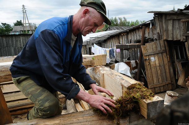 Он соглашается и рассказывает, что ставит баню. «Природный материал» нужен для того, чтобы в бане был необходимый аромат, а еще им утепляют стены.