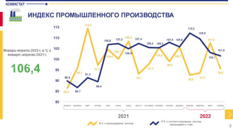Индекс промышленного производства в январе-апреле 2022 года относительно аналогичного периода 2021 составил 106,4% (в январе-апреле 2021 года был 89,3%).