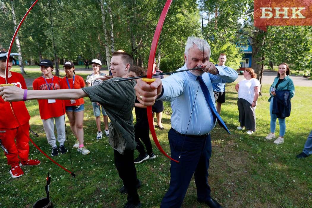 Глава Коми осмотрел, как устроен быт детей и как они проводят досуг, где они обедают и занимаются спортом. Даже пару раз сам выстрелил из лука, подержал в руке меч и примерил шлем. Дети продемонстрировали ему, как они состязаются при помощи тренировочных мечей.