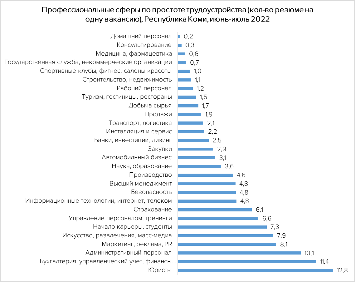 Сегодня в Коми проще всего трудоустроиться в профессиональных сферах «Домашний персонал» (0,2 резюме на одну вакансию), «Консультирование» (0,3), «Медицина, фармацевтика» (0,6), «Госслужба» (0,7), «Спорт клубы, салоны красоты» (1), «Строительство, недвижимость» (1,1), «Рабочий персонал» (1,2) – именно здесь наблюдается самая низкая конкуренция среди соискателей, имеет место выраженный кадровый дефицит, отмечается в исследовании hh.ru.