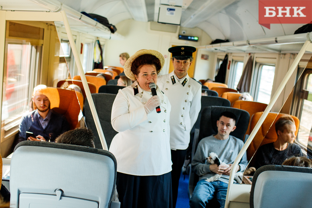 Но первый тур из Сыктывкара в Усть-Вымь сопровождали необычные проводники. Из Москвы прибыли историки транспорта Мария Калиш и Юрий Егоров. Еще на перроне их можно было выделить из толпы благодаря форме дореволюционного образца. Для женщины белый пиджак и черная юбка в пол с шляпкой и перчатками, для мужчины – белый пиджак, черные брюки и фуражка. Их одежда была сшита по историческим чертежам, это копия формы, которую носили первые работники железных дорог.