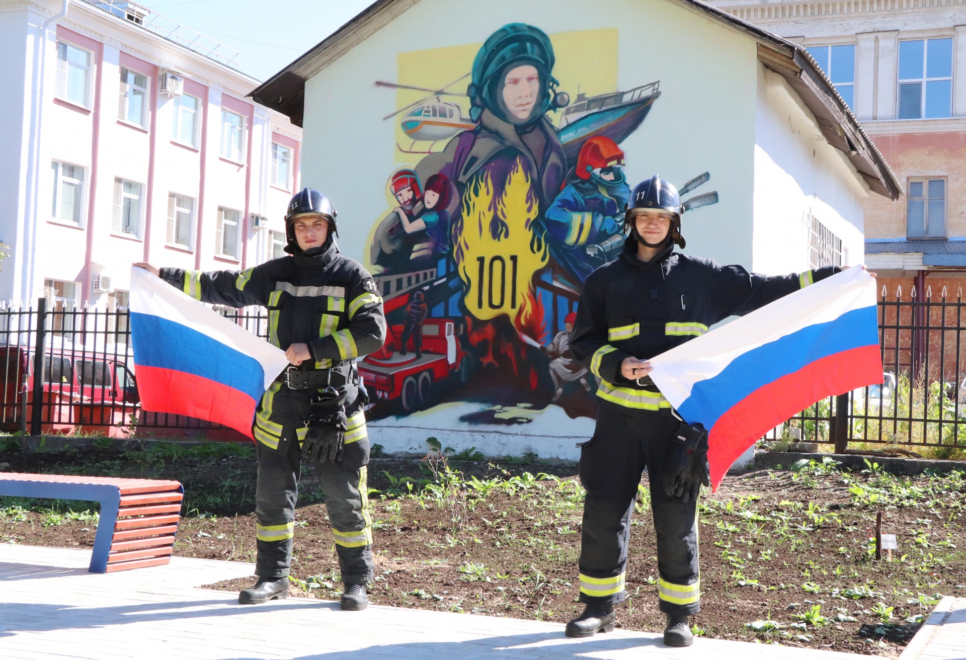 Представители подразделений чрезвычайного ведомства — пожарные и спасатели, инспекторы государственного пожарного надзора, сотрудники Центра управления в кризисных ситуациях и психологической службы, представители ветеранской организации ведомства — развернули на фоне стелы, установленной в сквере пожарных и спасателей, два десятиметровых флага — России и Республики Коми.