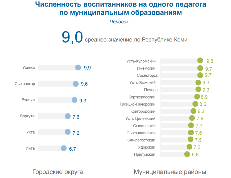 В среднем по республике на одного педагогического работника в 2021 году приходилось 9 воспитанников. В восьми муниципальных образованиях этот показатель был выше среднереспубликанского значения. Самая высокая нагрузка на одного педагога была отмечена в Усинске, а самая низкая — в Инте.