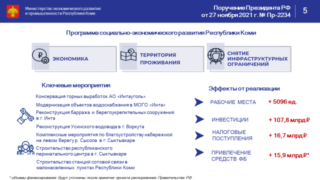 Объем федеральных средств, которые планируется привлечь на развитие республики – порядка 16 млрд рублей. В презентации к докладу также можно увидеть, что будет создано 5 096 рабочих мест. Инвестиции составят 107,8 млрд рублей, а налоговые поступления 16,7 млрд рублей.
