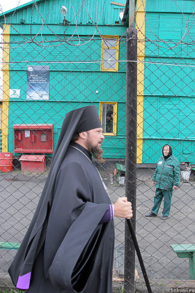 У храма владыку дожидались несколько дам из отряда № 2, выстроившиеся в два ряда. Зайдя вовнутрь, епископ сообщил, что храм в микуньской колонии стал одним из первых, построенных в рамках соглашения между епархией и ГУФСИН. По его словам, такие культовые объекты очень востребованы на «зонах».