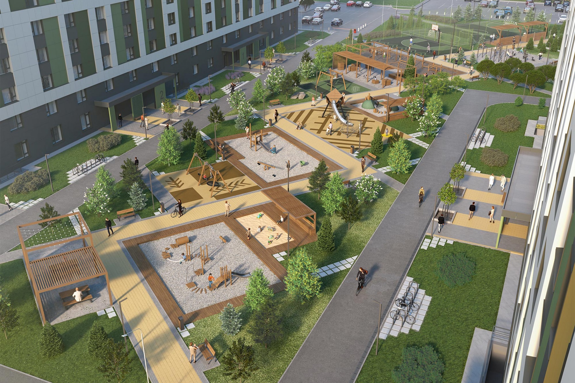 Между домами «Урмáна» образуется закрытый для въезда машин двор с парковками за его пределами. Двор, объединённый сетью пешеходных дорожек, превращается в большую прогулочную зону с разными сценариями досуга.