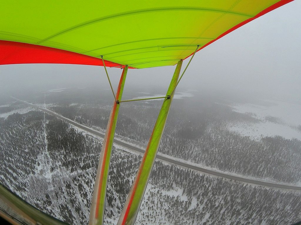 — Перед Ухтой строгая женщина с Ухта-Вышки приказала в черту города не входить. Больно надо мне свистеть над жилыми кварталами. Обошел Ухту с севера. Место посадки я заявил как реку Ижму за Сосногорском. Веселое разочарование, река встретила черной водой с небольшими заберегами. Оказывается, и тут идет сброс теплой воды, кажется, от ТЭЦ. Выбираю площадку на берегу рядом с рекой. Усть-Ижма совсем рядом. Перехожу на снижение, ветер тут у реки уже нешуточный — 80 км/час в лоб, бросает мощно то вправо, то влево. Диспетчер запрашивает, отвечаю, что нахожусь над точкой. Время 13:57. Помог след снегохода хоть и плохо различимый в пасмурной уже погоде. Примостился уверенно к нему и проскочив лыжами по талой воде в низинке, встал.