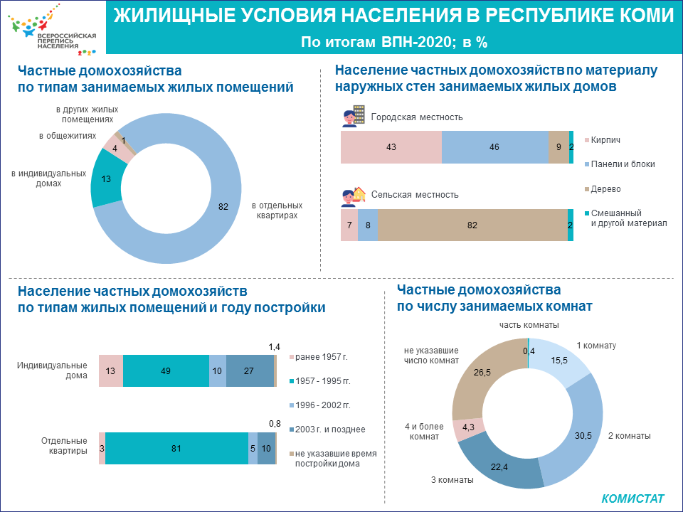 Как выяснилось после переписи, основная часть домохозяйств в Коми живет в квартирах (82%), 13% — в индивидуальных домах, 4% — в общежитиях и 1% — в коммунальных квартирах, гостиницах и других жилых помещениях.