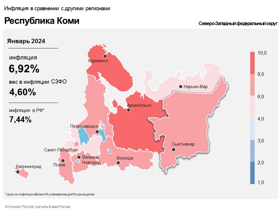 Региональная инфляция была ниже, чем по Северо-Западному федеральному округу (6,98%) и по России в целом (7,44%). Основными факторами замедления инфляции в республике стали рост предложения некоторых продовольственных товаров и эффект высокой базы прошлого года по жилищным услугам.