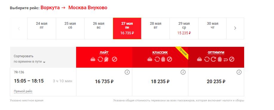 По данным системы бронирования, стоимость минимального тарифа из Воркуты в Москву (без багажа) на ближайшие даты начинается от 15 тысяч рублей, обратно — от 11 тысяч рублей. За тариф с багажом придется доплатить полторы тысячи рублей.