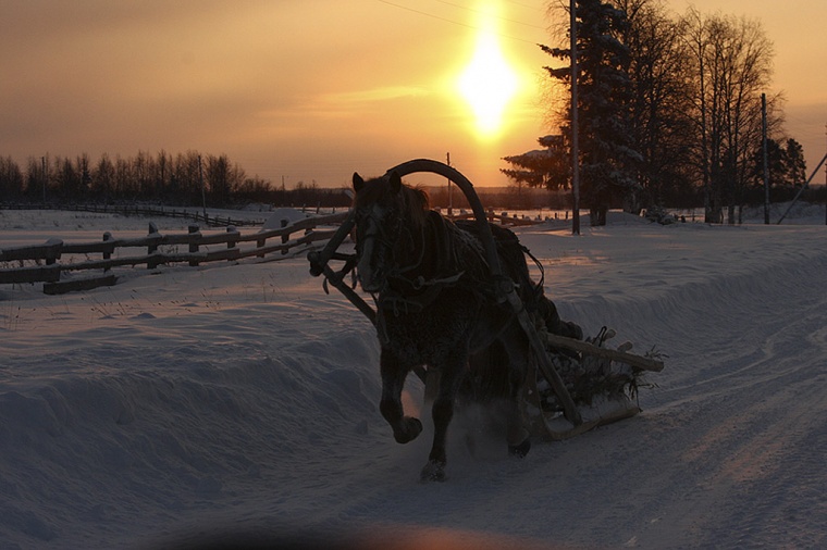 Нет уж, лучше лошадки и все, что с ними связано, оно как-то красивее! Кстати, в санях едет охотник, везет подстреленных зайцев-беляков.