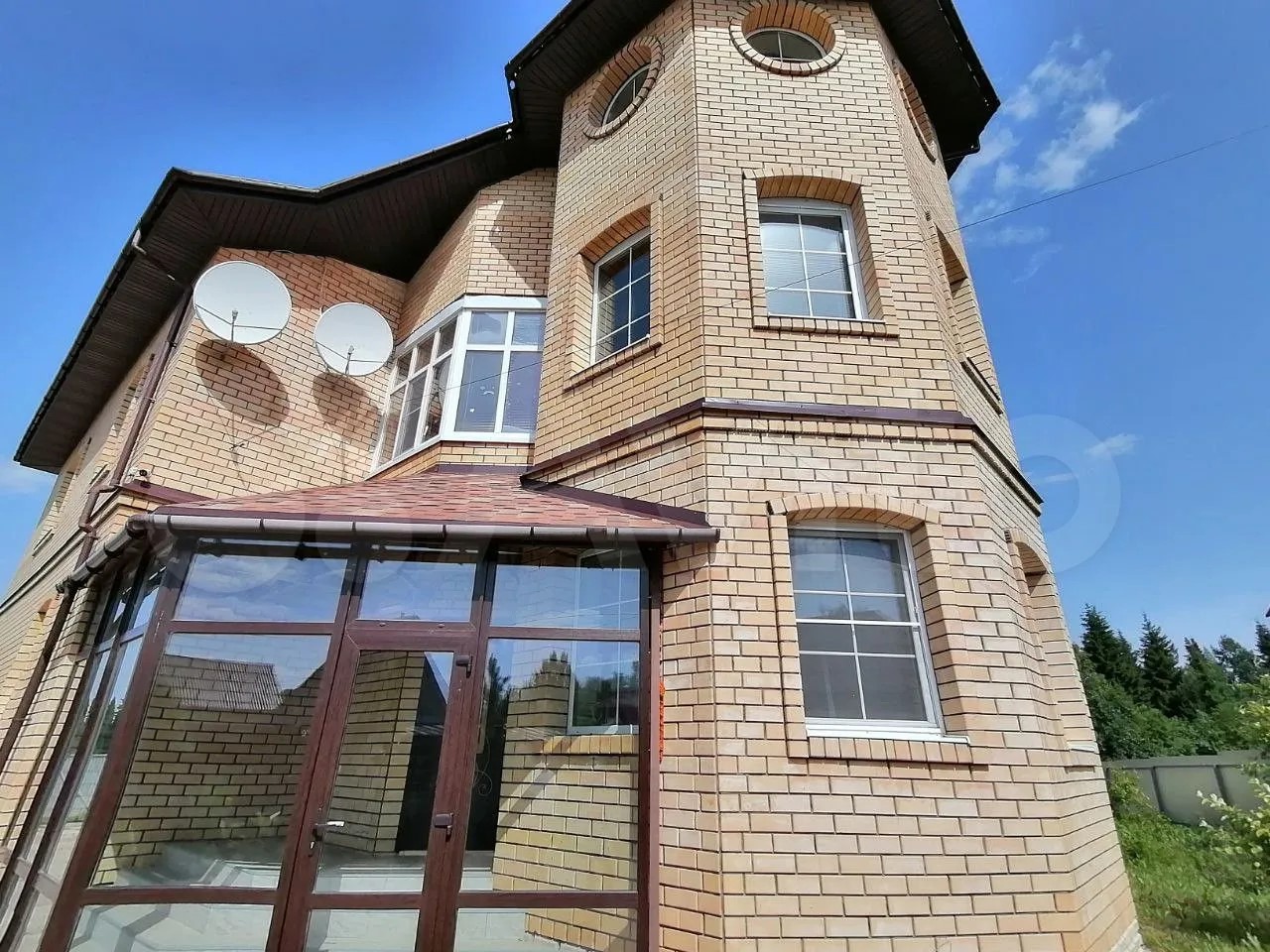 На участке в 10,8 сотки построены баня, теплица, детская площадка и бассейн. Территория огорожена забором с калиткой с видеодомофоном. В самом доме, площадь которого 240 квадратных метров, на втором этаже есть три спальни и ванная комната; какие комнаты на первом, автор объявления не указал.