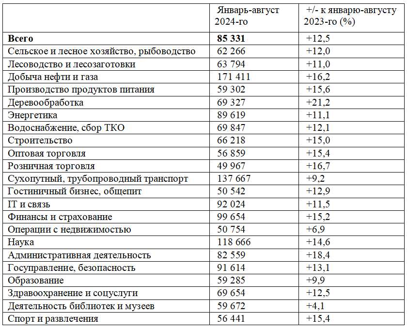Средний размер зарплаты за январь-август составил 85 тыс. 331 рубль. Эта сумма оказалась на 12,5% больше, чем за восемь месяцев 2023-го (правда, в реальном выражении рост составил всего 4,4%).