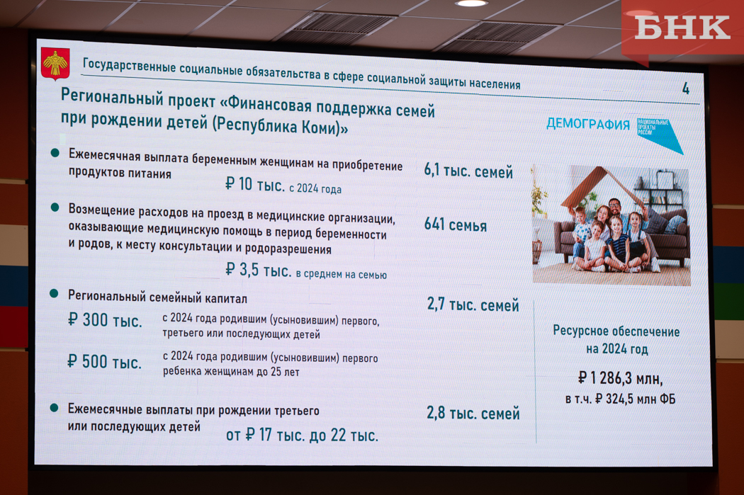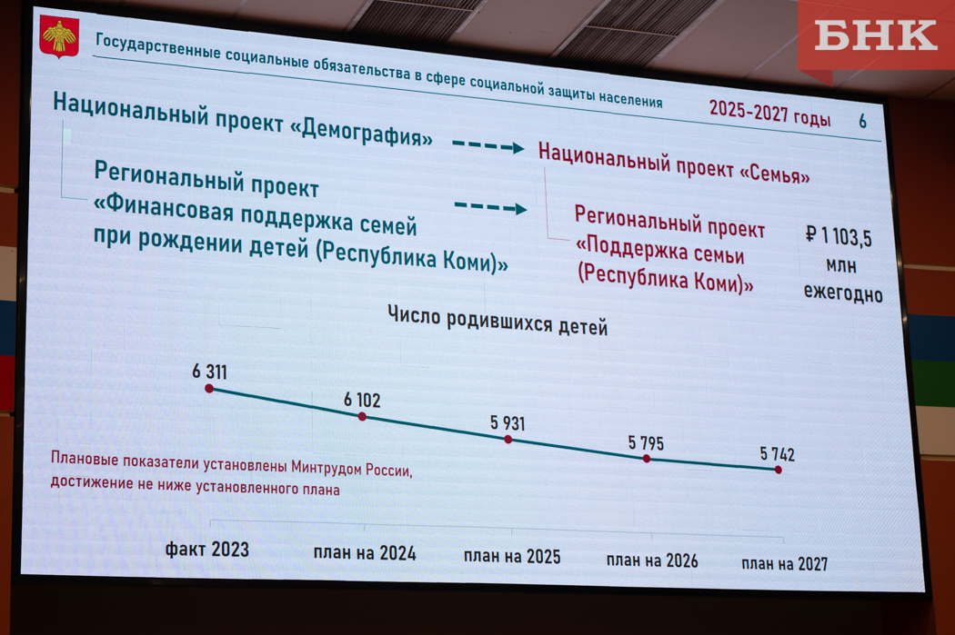 Министерство нацелено как на увеличение многодетных семей в регионе, так и на повышение рождаемости в целом. В Коми действует пакет мер, направленных на это: например, выплаты беременным на приобретение продуктов питания, выдача регионального и федерального семейного капитала, выдача «Подарков новорожденным».
