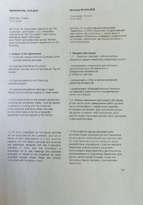 В Сеть слили договоры на оказание услуг, по которым «независимое культурное пространство» в Сыктывкаре «Револьт-центр» получал деньги от британской организации «Article 19» (признана нежелательной в России) и Немецкого культурного центра имени Гёте при Генеральном консульстве ФРГ в Санкт-Петербурге.