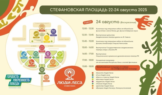 С 12:00 до 20:00 горожан ждет этнофестиваль «Люди леса». Мероприятие, указано на путешествуем.рф, посвящено продвижению традиций «лесных цивилизаций» с акцентом на культуру народа коми. В программе будут выставки, ярмарки, творческие встречи, мастер-классы, этношоу, лектории и воркшопы. Пройдет фестиваль в Стефановской площади, в сквере за ней, а также в парке имени Кирова.