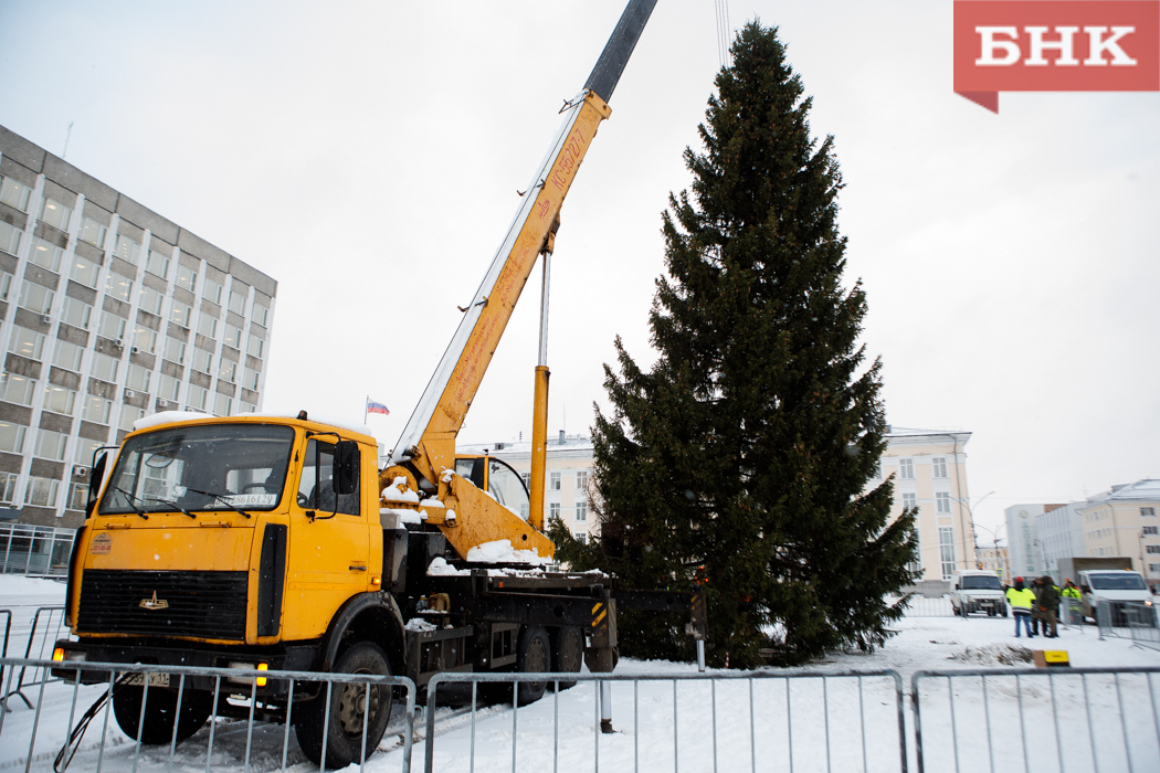 Праздничное дерево накануне доставили в столицу Коми из сыктывдинского Яснэга.