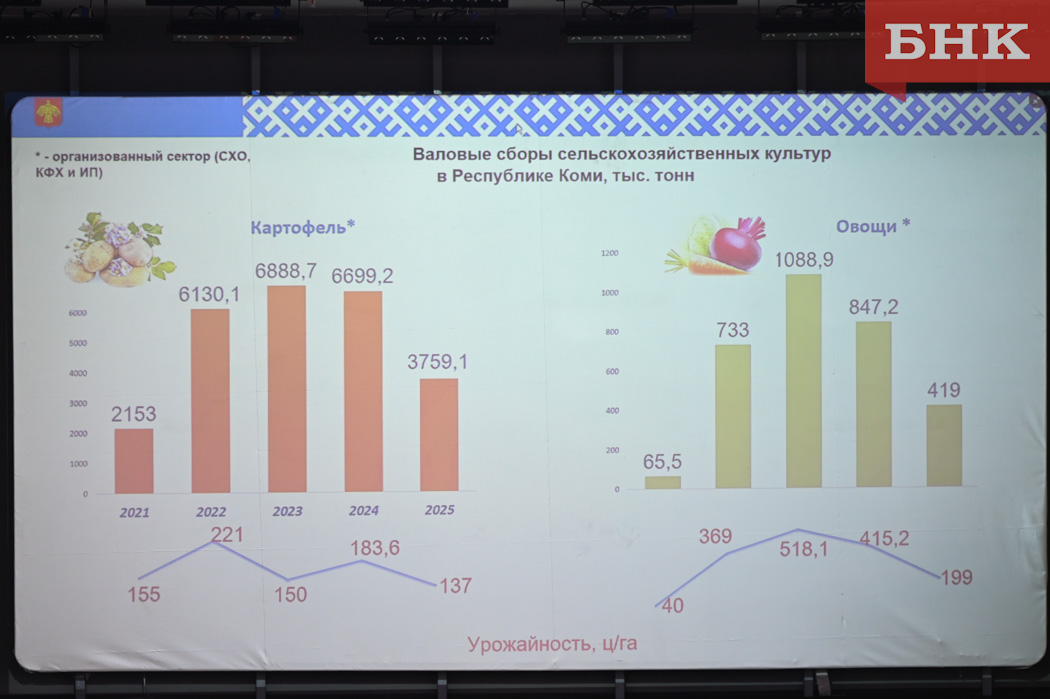 Как рассказала БНК начальник отдела растениеводства и мелиорации министерства сельского хозяйства Коми Ольга Лысенкова, в 2025 году отрасль столкнулась со сложными погодными условиями — обильные осадки в первую декаду лета, поздние заморозки. Также не обошлось без вредителей и заболеваний: картофельная совка, фитофтороз.