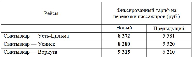 Министерство тарифного регулирования Коми 30 января издало приказ об установлении фиксированных тарифов на перевозки пассажиров и багажа, выполняемые «Комиавиатрансом». В документе перечислены тарифы на перевозки самолетами и вертолетами. Когда проект приказа выносился на общественное обсуждение, то в нем были указаны конкретные типы воздушных судов — самолеты Ан-24 и Bombardier CRJ-100/200 и вертолеты Ми-8. Однако в изданном приказе этих уточнений нет.
