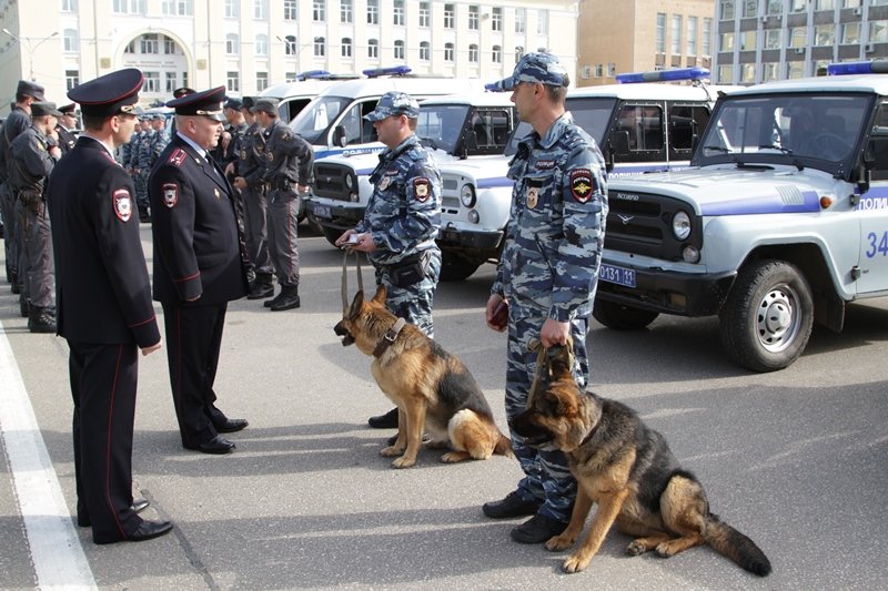 В построении был задействован личный состав строевых подразделений ОМОН, патрульно-постовой службы, госавтоинспекции, вневедомственной охраны, а также сотрудников Центра кинологической службы.