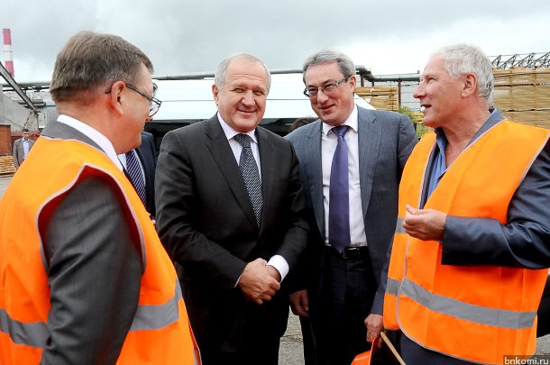 Как выяснилось, «завели» машины не зря. Спустя десять минут на площадке перед зданием цеха появились машины, из которых один за другим вышли глава Коми Вячеслав Гайзер и полпред президента по СЗФО Владимир Булавин.