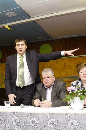 Как и почти полтора года назад в президиуме в зале школьной столовой рядом с Зенищевым уселись первый заместитель Сергей Гераймович, заместитель председателя совета Сыктывкара Татьяна Саладина, Юрий Пелевин и заместитель председателя комитета по законодательству и местному самоуправлению Василий Попов, который в 2007 являлся кандидатом в депутаты.