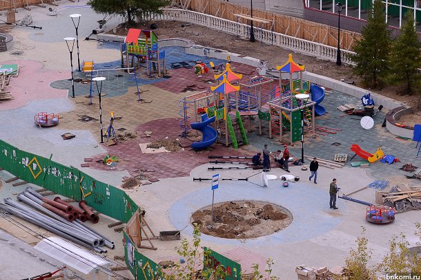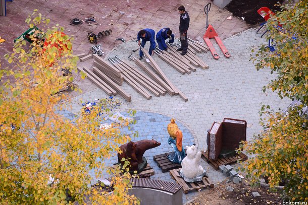 Кроме того, идет работа по укладке брусчатки и установке малых форм — сказочных героев, монтируются детская площадка, качели, скамейки. В ближайшее время планируется закончить монтаж освещения.
