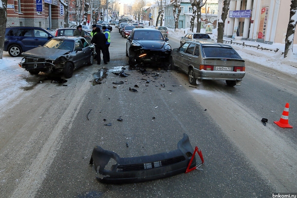 Авария с участием двух иномарок и отечественного ВАЗа произошла сегодня в Сыктывкаре около полудня. «Порше Кайен» двигался по Советской в направлении аэропорта, ВАЗ-2114 - в обратном направлении. Машины столкнулись в районе кинотеатра «Октябрь», а «Порше» еще и с движущейся по другой полосе «Ауди». От удара в «Кайене» сработала подушка безопасности, у «Ауди» вырвало передний бампер. Подробности происшествия уточняются.