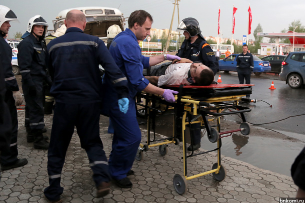 В Сыктывкаре на Сысольском шоссе возле остановки «АЗС» выехавший на встречную полосу автомобиль ВАЗ-21099 на большой скорости врезался в служебный автобус КАВЗ, принадлежащий ОАО «Коми дорожная компания». Водитель легковушки в тяжелом состоянии извлечен из покореженного авто спасателями.