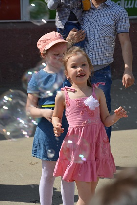 У магазина «Ассорти» на кольце в это же время проходила развлекательная программа для детей: спортивные эстафеты для самых маленьких; научно-познавательное шоу для любопытных; аквагрим для всех желающих; мыльные пузыри для самых улыбчивых. Любой прохожий мог сфотографироваться в образе мультгероев. Все дети получили сладкие призы.