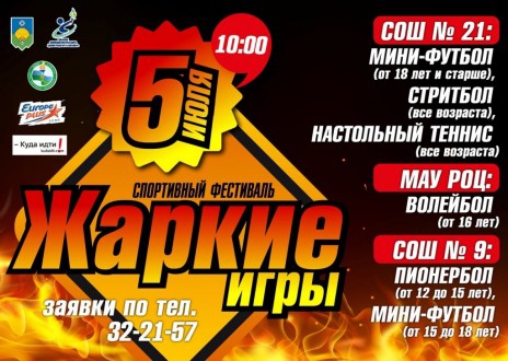 Сыктывкарцы в воскресенье, 5 июля смогут согреться в «Жарких играх» от городского центра спортивных мероприятий. Сразу на трех площадках — возле школы № 21, возле школы № 9 и в Эжве по Мира, 37а возле МАУ РОЦ будут проходить игры по мини-футболу, стрит-болу, настольному теннису, волейболу и пионерболу. Старт одновременный в 10:00.