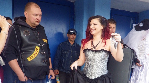 Так, шумно и весело, воркутинки добрались до спорткомплекса «Олимп», у подножия которого состоялась главная часть мероприятия – вручение приза байкерских симпатий. Правда, прежде девушкам было предложено потанцевать, чтобы дать байкерам время определить лучшую из невест. Недолго думая, молодые особы пустились в пляс. Каждая невеста старалась быть неотразимой, ритмично двигаясь под рок-музыку под дождем, прыгая по лужам, некоторые девушки даже падали в стремлении проявить себя как можно ярче.