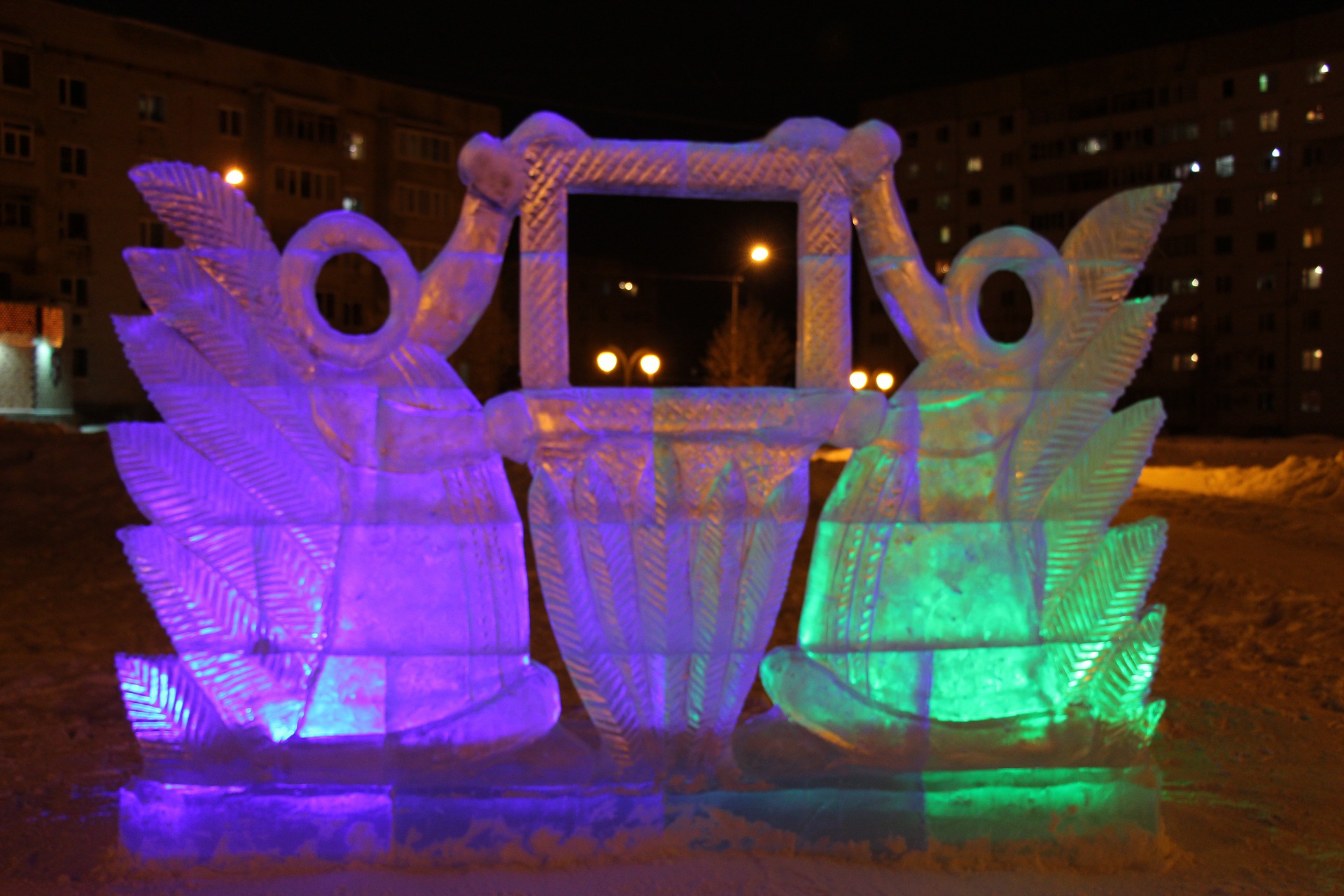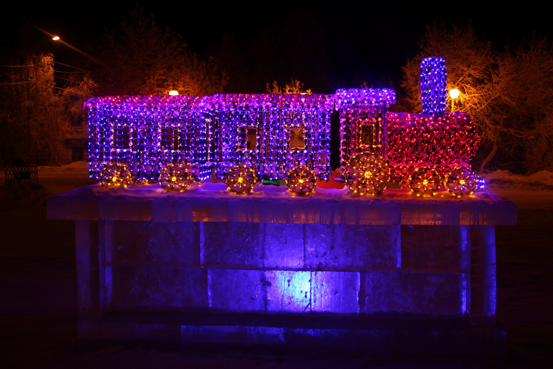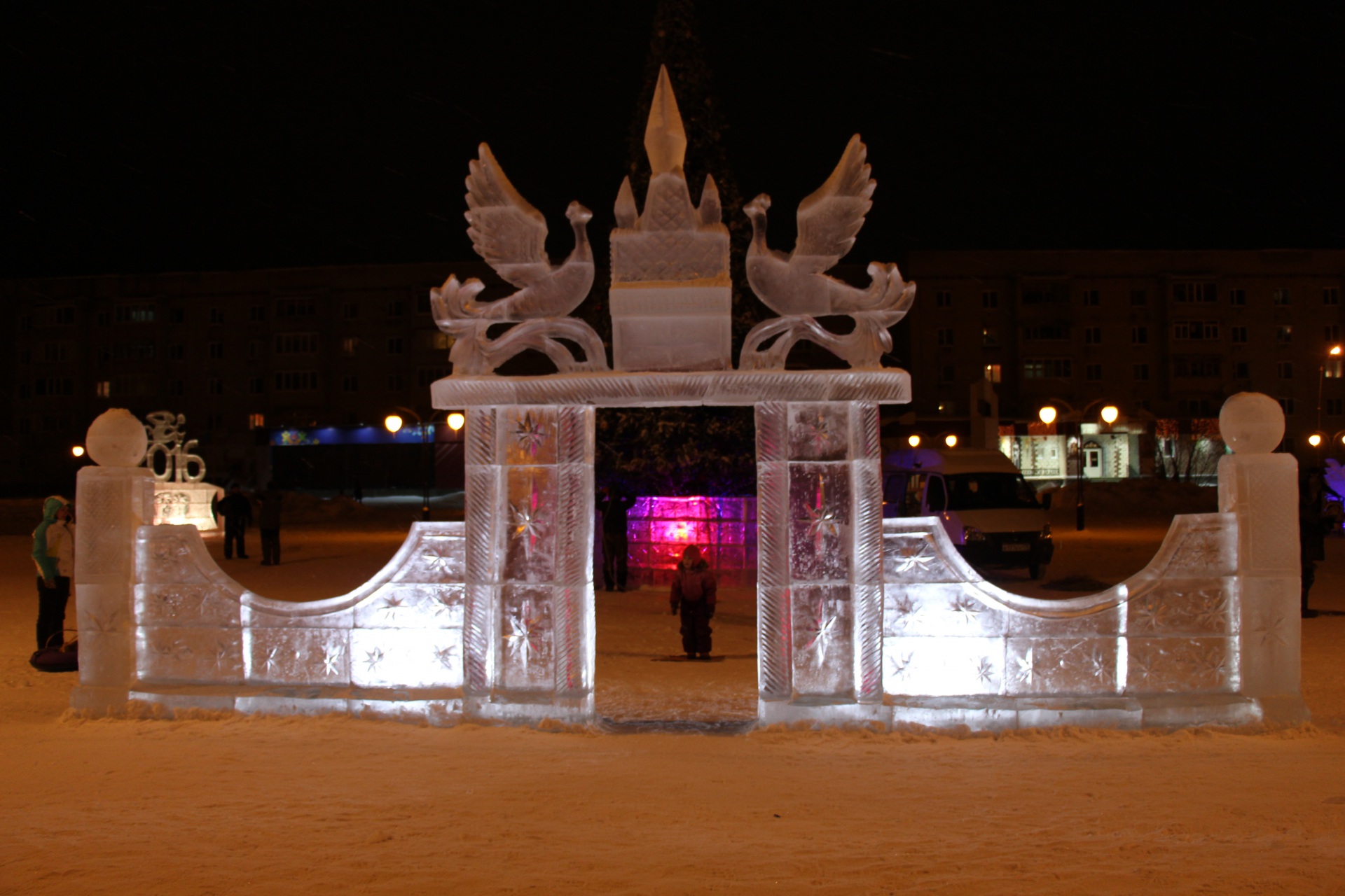 Новый год - самый волшебный и долгожданный праздник. В преддверии торжества в этом году на площади Юбилейной в городе Печора местных жителей радуют ледяные скульптуры, среди которых Дед Мороз и Снегурочка на снегоходе композиции «Символ года» и «Фоторамка», а также три вида детских горок, оформленных в виде сказочных персонажей с длиной ската от 3 до 5 метров. Ко всем ледовым композициям подведена цветная подсветка. Впервые в этом году установлено ледовое ограждение вокруг елки. Дополняет ледовую композицию на площади Юбилейной объемный светящийся кораблик.
