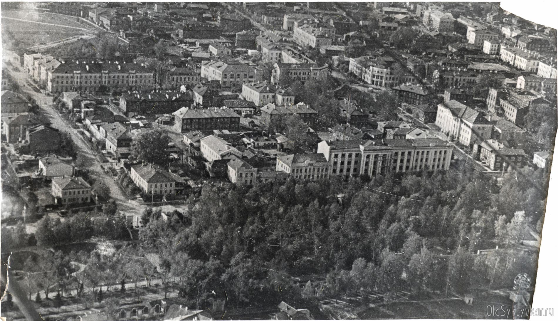 Доброе утро! Этот снимок «Старого Сыктывкара» сделан с самолета в середине 1950-х годов. Все каменные здания сохранились до наших дней. Большинства деревянных домов уже нет.
