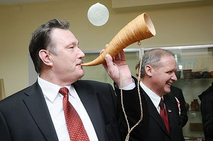Напоследок они зашли в помещение, где продают то, что сделали в центре дети. Пока Вячеслав Гайзер осматривал товар и убеждал всех, что у него «глаза разбегаются», Рудольф взял в руку рожок из бересты и дунул в него. Свое краткое музыкальное произведение на берестяном изделии он приурочил к началу строительства этнопарка.