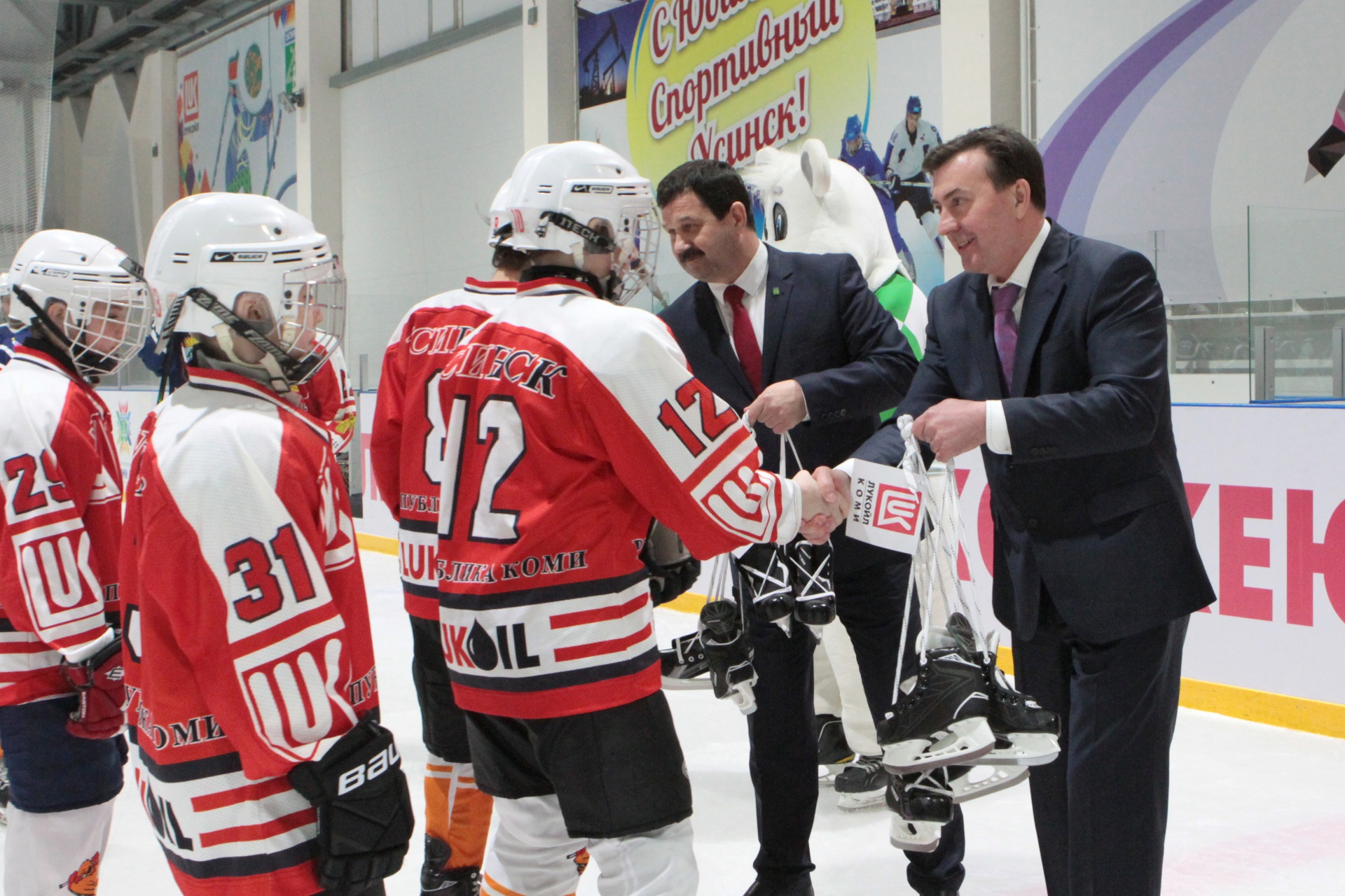 Во время церемонии открытия генеральный директор ЛУКОЙЛ-Коми и руководитель администрации вручили юным усинским хоккеистам 30 пар коньков в подарок от предприятия. Как известно, хоккейная экипировка – вещь настолько же значимая для игрока, насколько и дорогостоящая, так что не все родители могут позволить себе качественные коньки для своего маленького спортсмена.